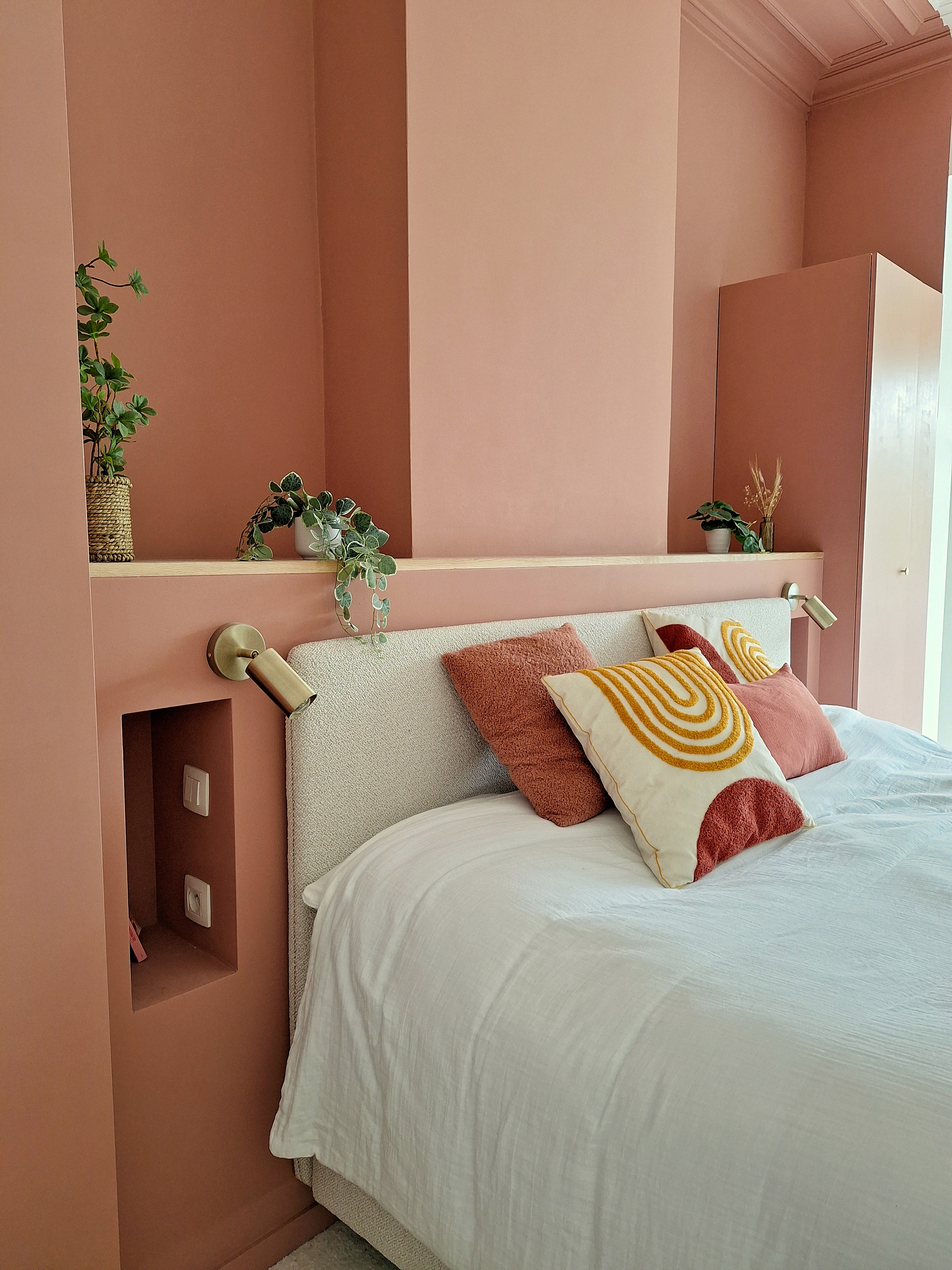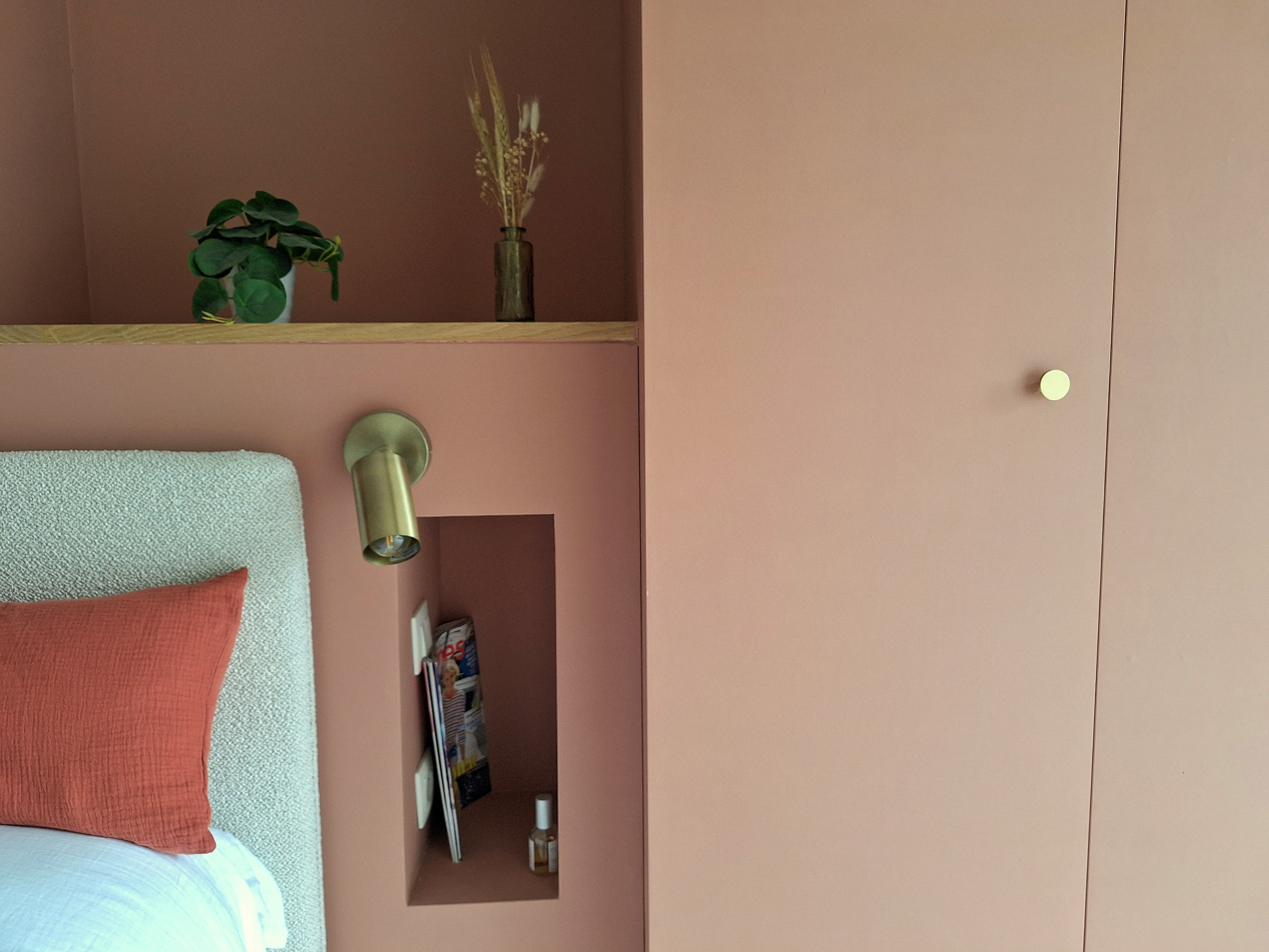 La chambre parentale a été repensée avec une tête de lit sur mesure et niches intégrées.
